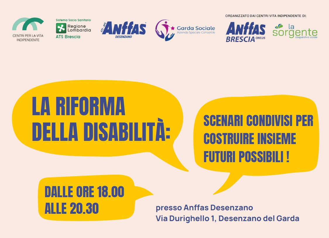 I Centri per la Vita indipendente dell'Ambito 11 organizzano due serate per conoscere meglio la riforma della disabilità, per immaginare e costruire insieme i prossimi passi verso una società sempre più inclusiva. Al centro la persona con disabilità che definisce il proprio progetto di vita individuale, personalizzato e partecipato, a partire dai suoi desideri, dalle sue aspettative e preferenze attraverso la definizione di sostegni formali ed informali che prevedano la trasformazione del sistema dei servizi e della società in una chiave sempre più rispettosa dei diritti delle persone.